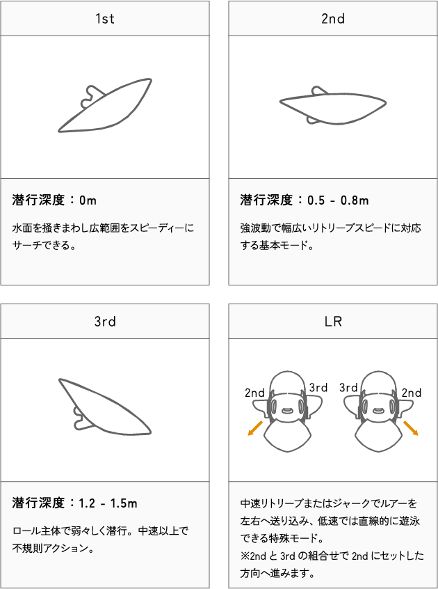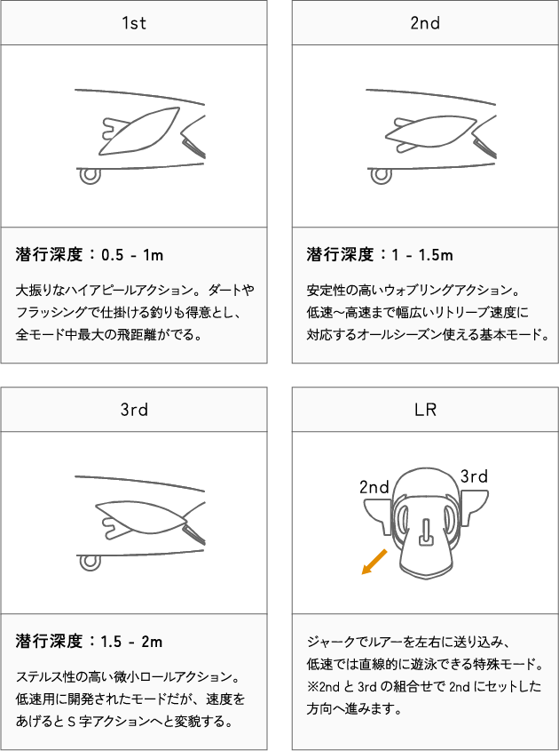 クウィングシステム(可動ヒレ)を搭載した、レンジとアクションが切替できる重心移動搭載ミノーです。左右に進行できるLRモードは、ジャークによる強力なフラッシングと共に、シャープかつワイドにスライドします。