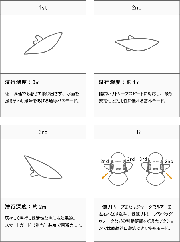3つの特許システムを搭載し、工具不要でルアーの性質を根本から 変化させることができます。また、テールを交換することによって、 クランキングやドッグウォークに特化したルアーにもチューニング可能です。